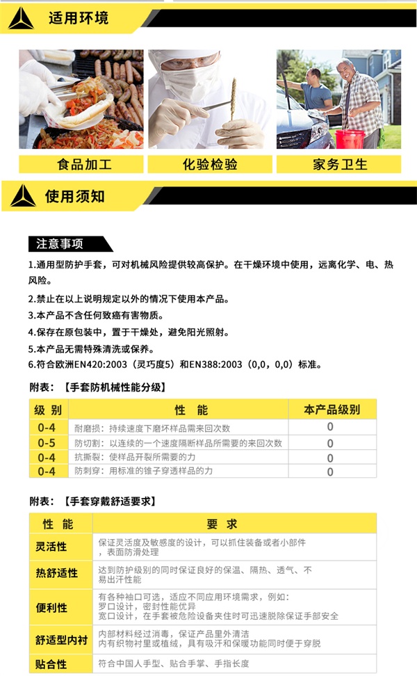 此手套符合欧洲指令89/686(个人防护),安全无害,舒适灵活。符合EN420:2003 (灵活度 5) 和EN374-2:2003 (渗透:1)- 微生物风险:等级2-AQL 1,5。符合与食品接触材料有关的89/109/EEC指令 (*) 和与食品接触塑料有关的指令2002/72/EEC (废除90/128/CEE)*符合85/572/CEE指令规定的转移极限测量,适合于干、湿的脂肪类食品。