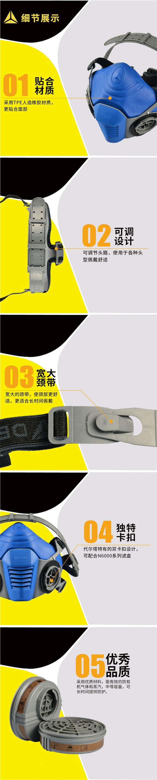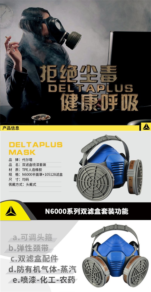 代尔塔105006 M6000双滤盒半面罩,TPE材质半面罩,弹性头颈带设计,带有可调节松紧头箍,可配合单独出售的M6000系列高容量滤盒使用。