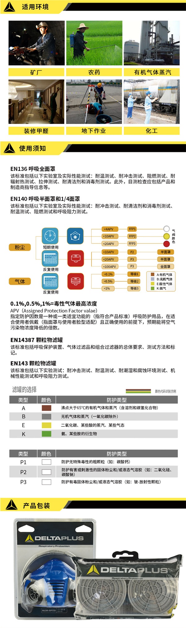 半面罩可用于防护粉尘、蒸汽和气体。建议当离开污染区域后仍继续佩戴面罩,直到衣服上的残留污染物完全消失。