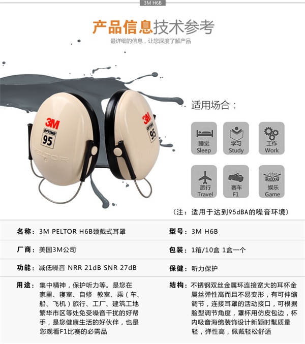 适合噪音水平:95分贝,独特的颈戴式设计,灵巧轻便,罩杯内衬隔音海绵,外周用仿皮包边,佩带卫生、安全、舒适,隔音效果良好。