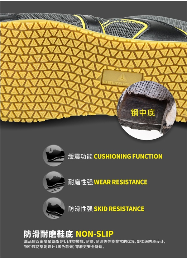 代尔塔301341 DS系列低帮轻便透气安全鞋,板鞋样式设计,融入更多时尚元素,PU中底能量缓冲吸收,橡胶牛筋外底,SRC级防滑效果更佳。同时具备防砸、防静电、防油,防刺穿功能,是安全鞋中重量非常轻的。
