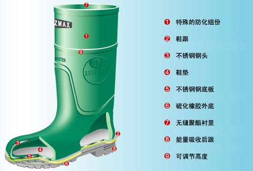 羿科Aegle 60700402 HAZMAX防化靴,特制HAZMAX材质,可防多种化学物质,硫化橡胶鞋底防油、防滑、防静电,在-30摄氏度的低温环境下仍可保持灵活性,含有安全性能符合EN345-1并能吸收200J能量冲击的钢头以及防穿刺钢底,无缝结构,鞋后跟有减震作用,在300摄氏度下可耐热接触60秒,存放期高达10年。