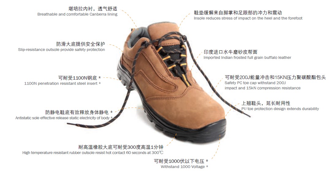 羿科Aegle 60718153 休闲款安全鞋,印度进口水牛磨砂皮帮面,上翘鞋头,延长耐用性,防滑大底提供安全保护,耐高温橡胶大底可耐受300度高温1分钟,BK布内衬,透气舒适,鞋垫缓解来自脚掌和足跟部的冲力和震动,可耐受200J能量冲击和15kN压力聚碳酸酯包头,可耐受1100N凯芙拉中底*,可耐受1000伏以下电压*,防静电鞋底有效释放身体静电*