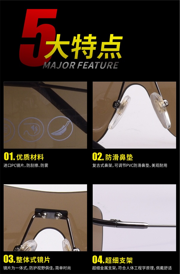 复古飞行员款安全眼镜,高端PC镜面,可调节PVC防滑鼻垫,超细全金属支架。符合人体工程学原理,佩戴舒适。时尚与安全并行,舒适与耐用双拥。