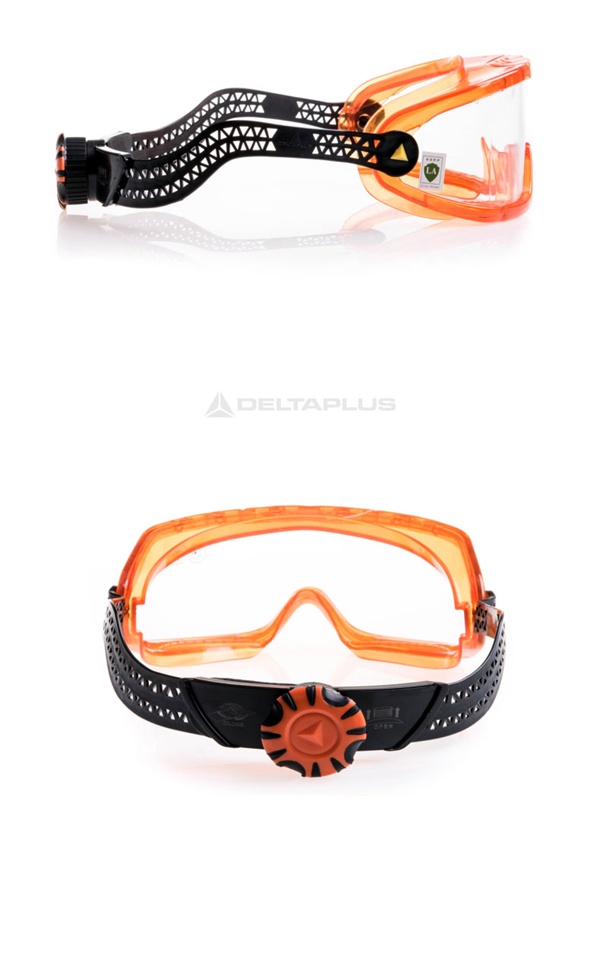 代尔塔101157 高强度防化护目镜,PVC框架,PC镜片。优异的防化防冲击能力,160°超大安全视角,让你完全没有视线死角的担忧。代尔塔ROTOR®一键调整系统,侧面2个连接位置可根据头型调节高低,适合不同脸型人员佩戴同款护目镜。