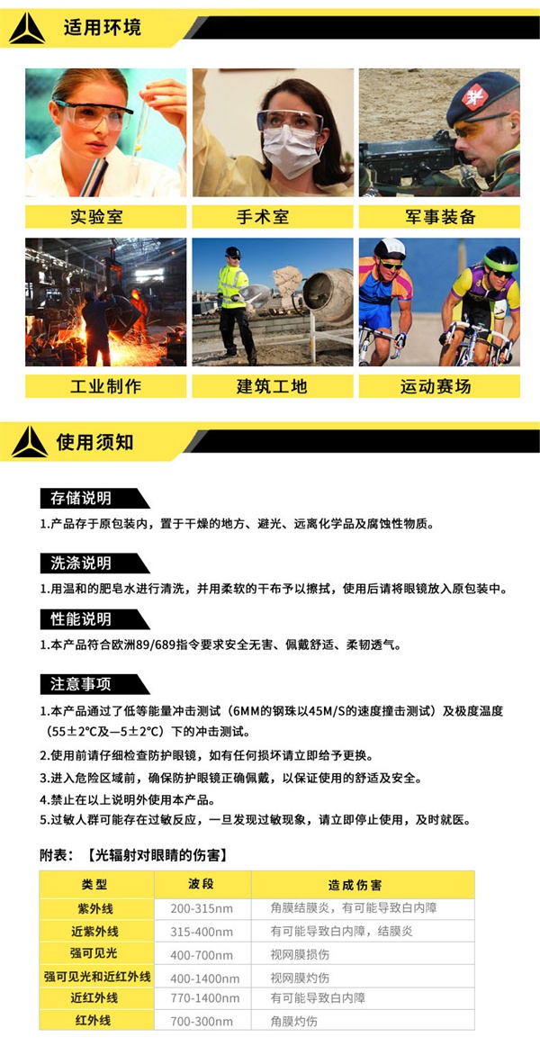 1、根据不同的使用目的,正确地选择防冲击眼护具的级别,1级、2级防冲击眼镜分别用Gl、G2表示,同时,使用时还应注意检查产品的标识;