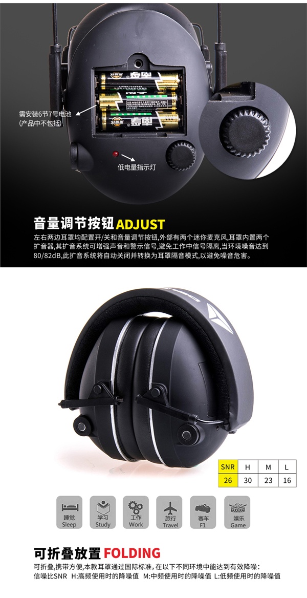 代尔塔103015 可折叠电子耳罩,ABS外壳,软垫箍紧。耳罩工作时需安装6节7号电池(产品中不包括)。