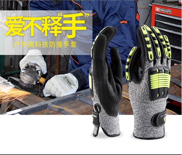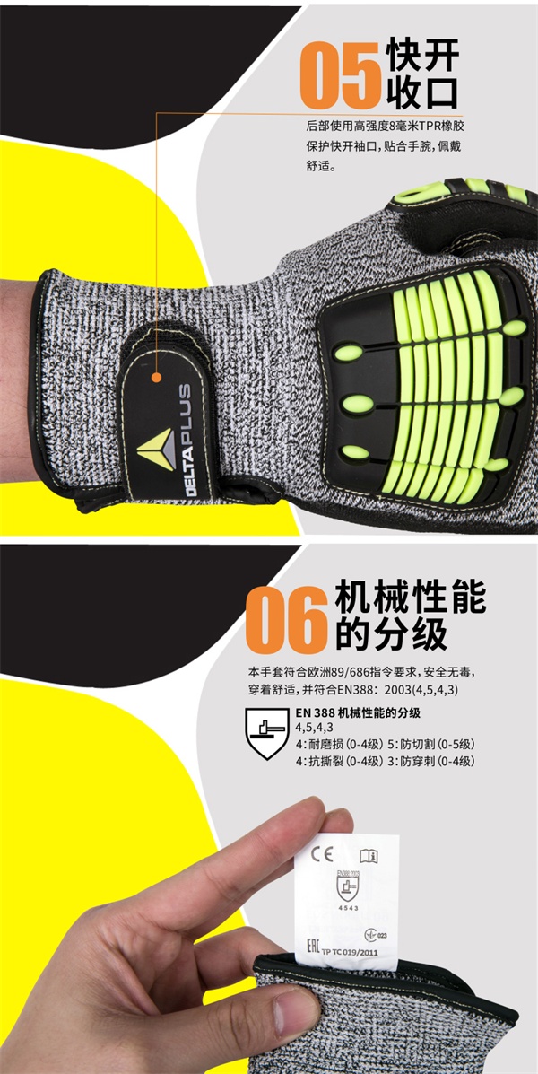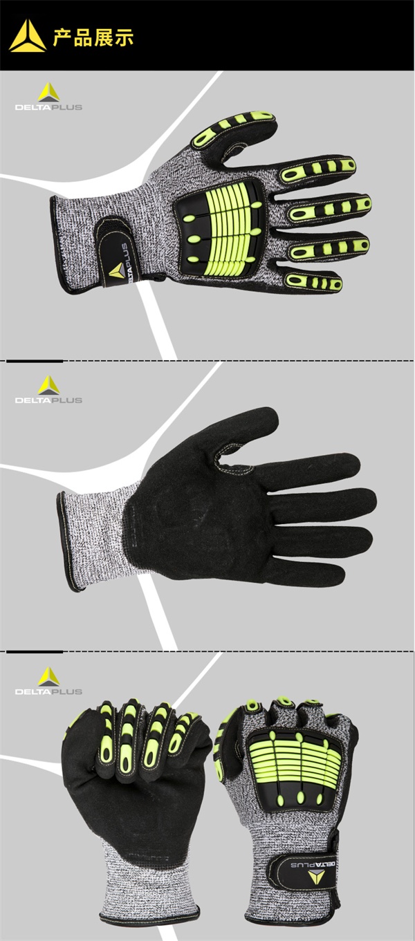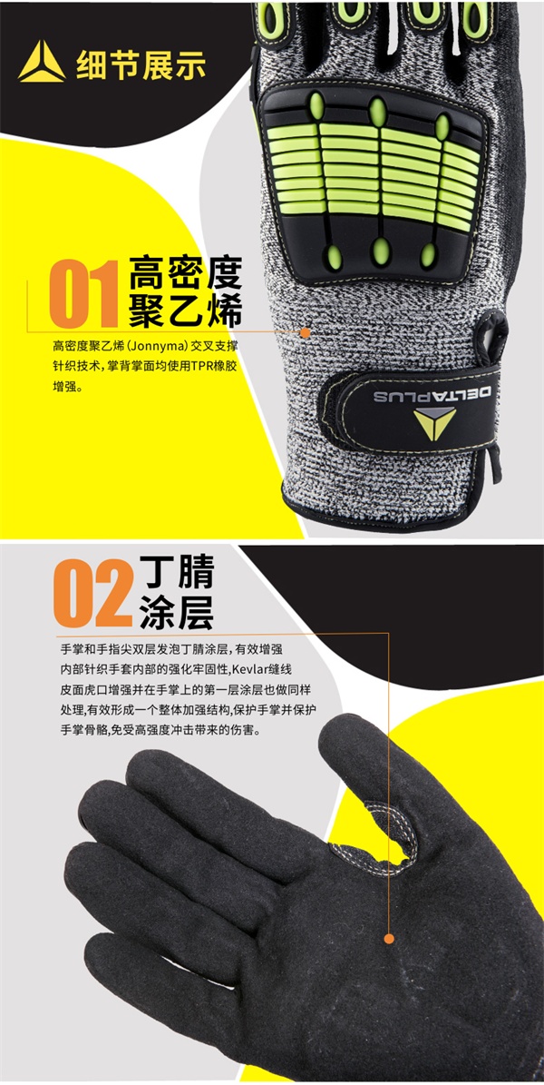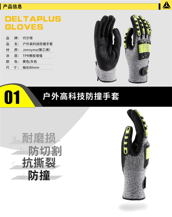 代尔塔209910 户外高科技防撞手套,高密度聚乙烯(Jonnyma)交叉支撑针织技术,掌背掌面均使用TPR橡胶增强。适用于搬运、物流、高空作业等容易遭受碰撞的行业。
