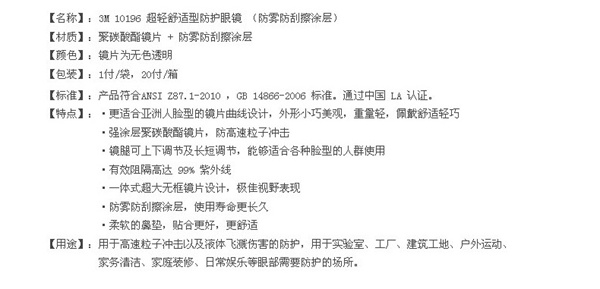 产品名称:3M 10196 超轻舒适型防雾防刮擦防紫外线防护眼镜