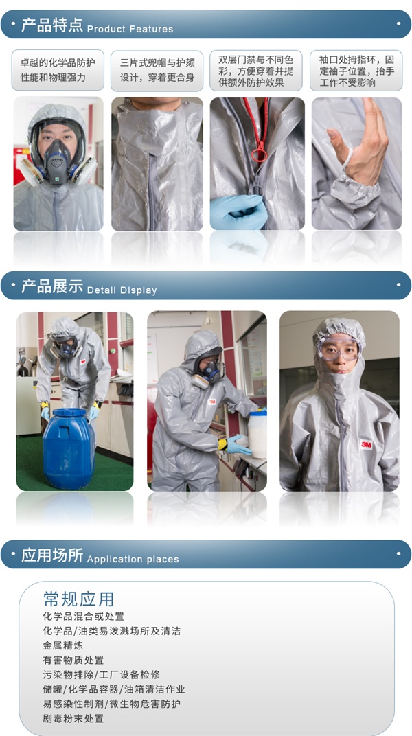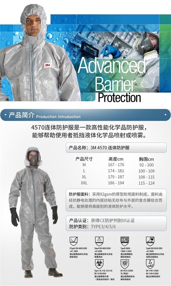 3M 4570连体防化服是一款高性能化学品防护服,获得CE防护类别III认证,防护类型Type3/4/5/6,能够帮助使用者抵挡液体化学品喷射或喷雾。防化服的一些独特设计:设计增大的拉链环以及拇指环,双层拉链门襟及护颏,在保证高水平防护性能的同时使防化服穿着更加健康。