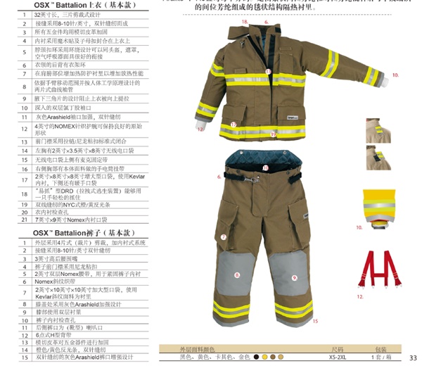 雷克兰 OSX™Battalion 美标消防战斗服,是雷克兰最受欢迎的消防战斗服。消防服上衣32英寸长,采用三片剪裁式设计,消防裤采用高后腰设计,这些设计让消防员可以灵活活动,没有束缚。8点式背带穿着舒适,长时间穿着也不会感到疲劳。面料采用网格编织,结实耐用。这些特点使Battalion™消防战斗服性能优于其他品牌的消防战斗服。