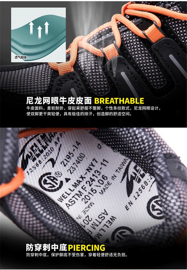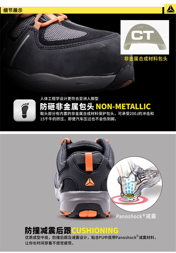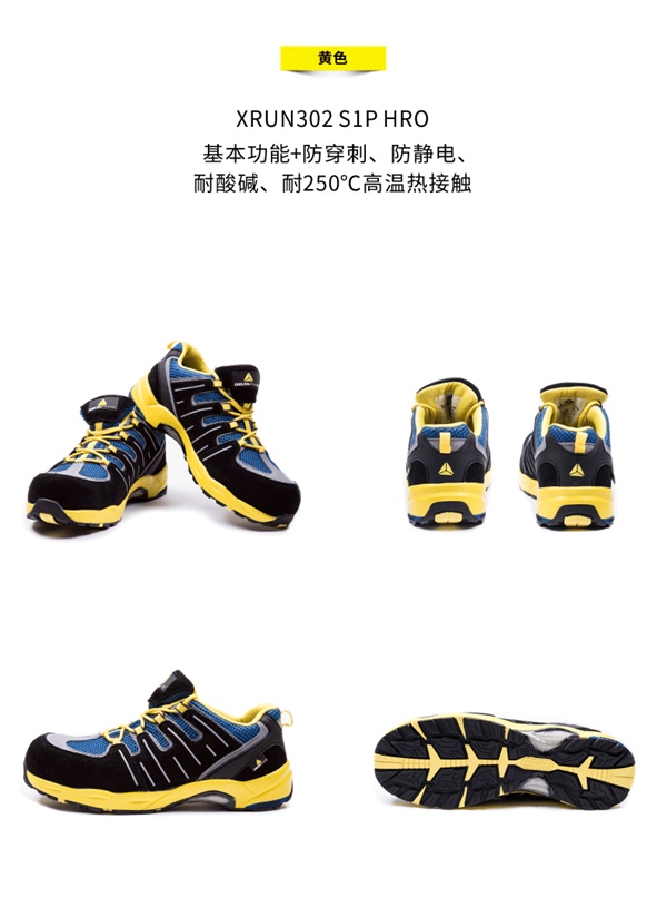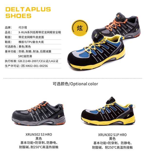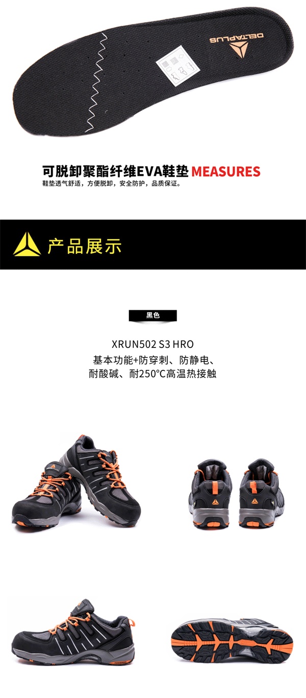 代尔塔301352 X-RUN系列新款低帮带尼龙网眼安全鞋,带尼龙网眼牛皮皮面,聚酰胺吸湿衬里,可脱卸预成型聚酯纤维EVA鞋垫,粘合PU中底带Panoshock减震材料,非金属合成材料保护包头和防刺穿中底,橡胶与TPU复合大底,兼具两者优势。防砸、防刺穿、防静电、后跟减震、耐磨、耐油、耐酸碱、SRC级防滑、耐250℃高温热接触。透气性能卓越、适合在闷热场合长时间穿着。XRUN502为橙色S3款